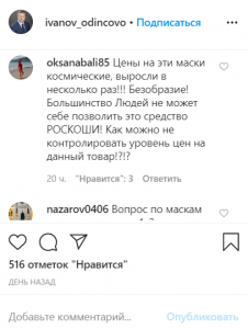 “Цены на эти маски космические, выросли в несколько раз!!! Безобразие! Большинство Людей не может себе позволить это средство РОСКОШИ! Как можно не контролировать уровень цен на данный товар!?!?”