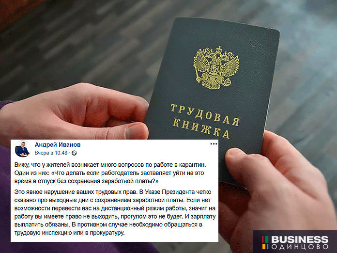 Глава Одинцовского округа посоветовал своим подписчикам в Facebook обращаться в трудовую инспекцию или в прокуратуру, если работодатель «заставляет уйти в отпуск за свой счет». Иванов сослался на указ президента, в котором прописан пункт о сохранении заработной платы в эти нерабочие недели.