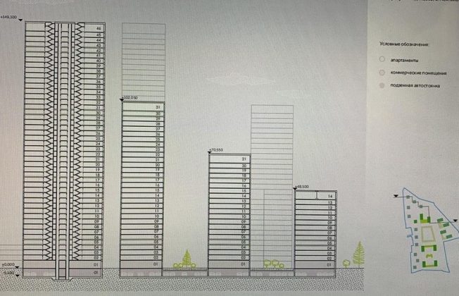 Сообщается, что проектом предусмотрено строительство 22 домов переменной этажности (от 14 до 46 этажей). Количество машиномест — 2.875. Общая площадь застройки — 683.400 м2.