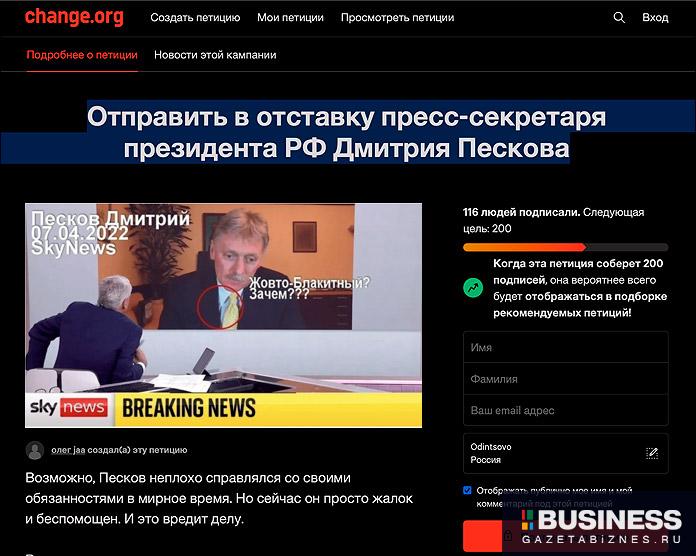 «При этом его жена и дети находятся в Великобритании. Считаем Дмитрия Пескова олицетворением т.н. «пятой колонны» в России, которая пособничает информационной войне против РФ и деморализации наших военных и обращаемся к Президенту РФ с просьбой отправить его в отставку», — говорит автор петиции «Отправить в отставку пресс-секретаря президента РФ Дмитрия Пескова», созданной на сайте change.org.