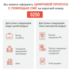 «Получить цифровой пропуск в Подмосковье можно по короткому номеру 0250. На него надо отправить смс, обозначив цель поездки. Чтобы поехать на работу, требуется указать: код цели, тип паспорта, его серию, номер, дату рождения заявителя, номер машины, данные карт «Тройка», «Стрелка», ИНН организации, её краткое наименование», — говорится в сообщении.