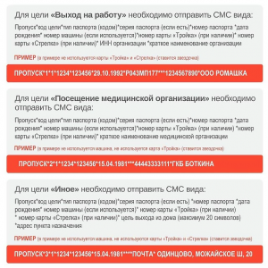 Для поездок на работу необходимо указать код — цифра «1». Сообщение содержит слово «пропуск», данные должны указываться в ряд через знак «*».