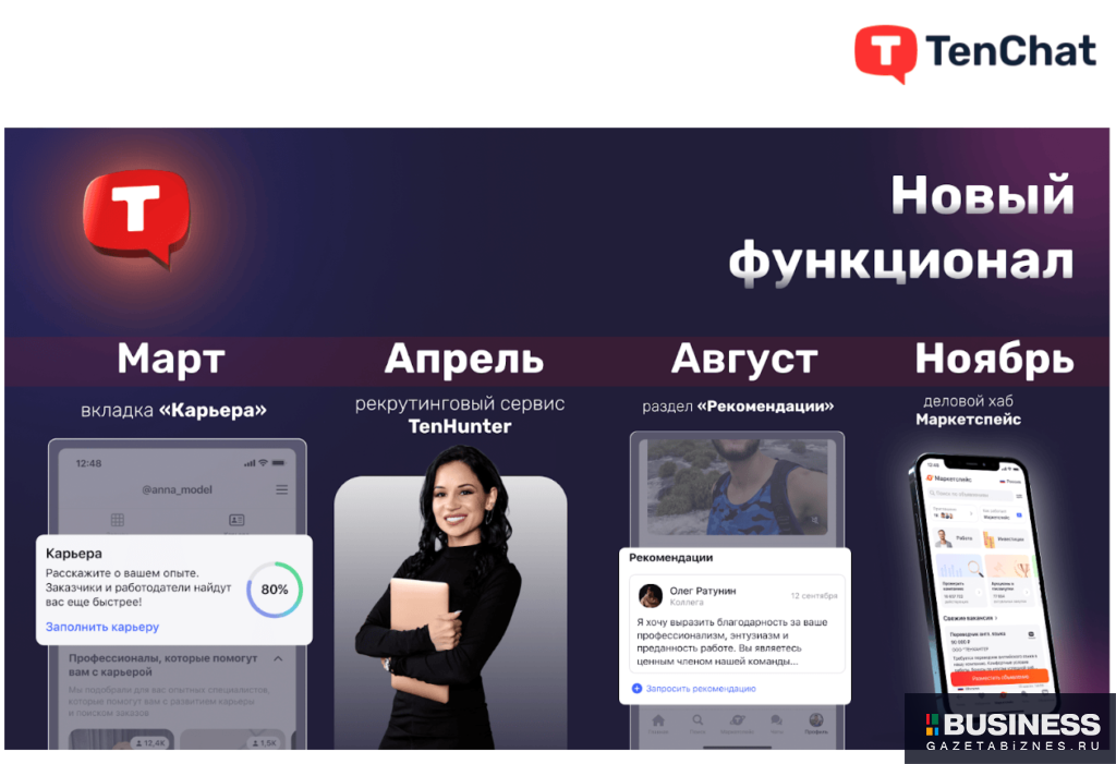 За первый год работы в TenChat были реализованы такие ресурсы для делового сообщества, как «Бизнес.Тиндер» (инновационная платформа для нетворкинга с механикой дейтинг приложений), аналитику всех компаний РФ, AI-поиск тендеров по ИНН вашей компании, деловой мессенджер. Кроме этого, для авторов открылся доступ к бесплатным многомиллионым охватам благодаря алгоритмам «Зевс» и «Афина», которые помогают продвигать материалы пользователей в соцсети и поисковых запросах . К 2022 году аудитория TenChat превысила более 1,7 млн пользователей, 60% из которых — предприниматели и топ-менеджеры.